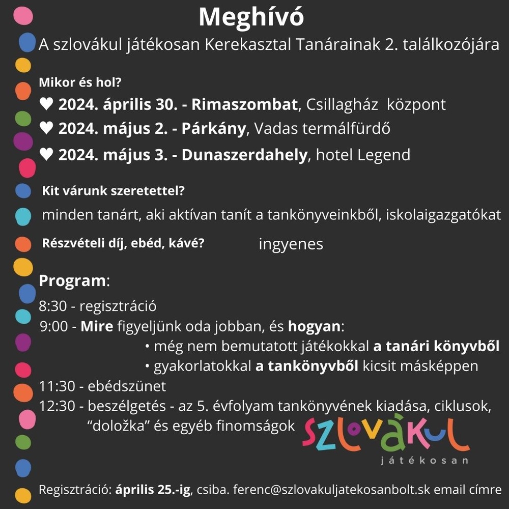 A szlovákul játékosan Kerekasztal Tanárainak 2. találkozójára Párkányban a Vadas termálfürdő épületében 2024. május 2-án került sor 36 pedagógus részvételével, akik a párkányi, nagyölvedi, farnadi, ipolyviski, kétyi, érsekújvári, izsai, muzslai, udvardi, kéméndi, hetényi és szalkai alapiskolákból érkeztek.